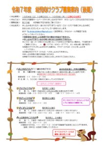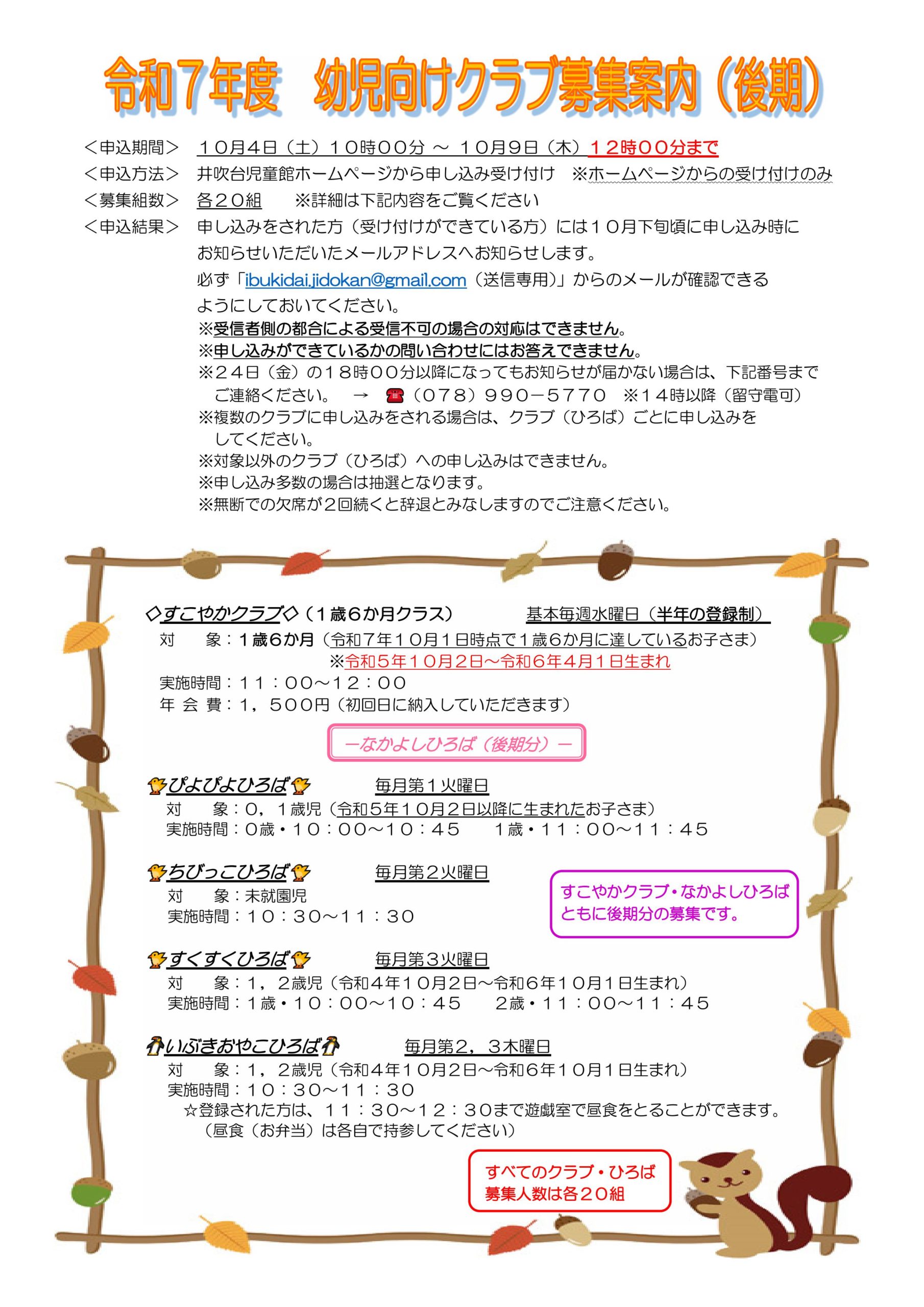 幼児向けクラブ・ひろばの後期分の募集を行います。